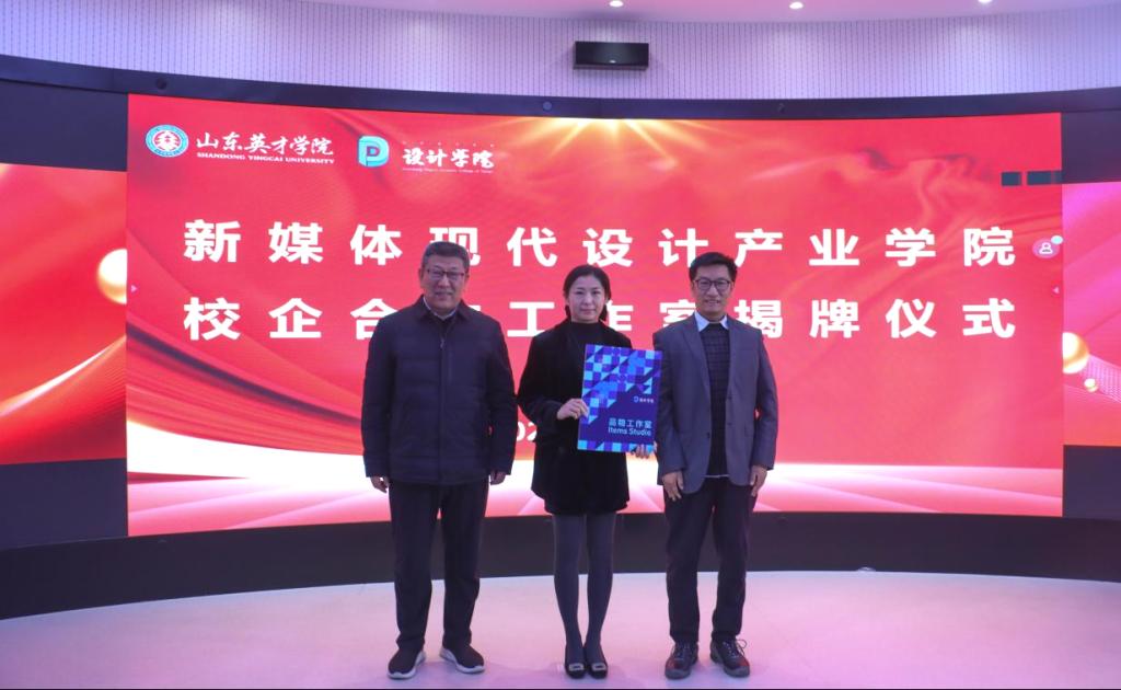 在全场嘉宾的共同见证下,山东英才学院副校长崔奎勇为三个校企合作工作室揭牌,标志着工作室正式投入运行。随后,郝莹院长代表设计学院为合作企业代表颁发聘书,聘请企业负责人与设计总监担任工作室企业导师,全程参与教学指导与项目实践环节。